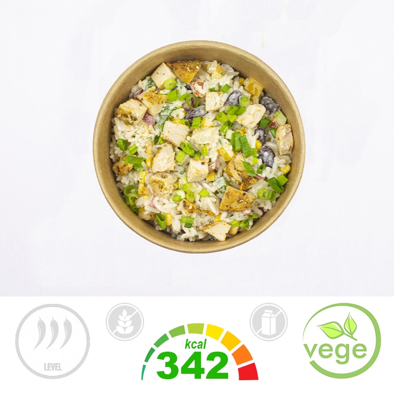 Składniki: Sałatka Ryżowa (Ryż Biały, Kukurydza (Konserwowa) (Kukurydza, Woda, Sól), Fasola Czerwona (Konserwowa) (Fasola Czerwona, Woda, Sól), Majonez Domowy (Olej Rzepakowy, Pasteryzowane Żółtka JAJ, Musztarda), Papryka Czerwona, Papryka Zielona, Papryka Żółta, Koper Ogrodowy, Pieprz Czarny, Sól, Woda) (74%), Kurczak do Sałatek i Zup (Filet z Piersi Kurczaka, Olej Rzepakowy, Papryka Słodka, Majeranek, Czosnek, Curry, Pieprz Czarny, Sól) (14%), Ananas (12%) Szczypiorek